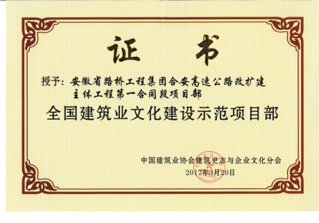 近日,由公司承建的合安高速改擴(kuò)建主體工程第一合同段項目榮獲首批“全國建筑業(yè)文化建設(shè)示范項目部”稱號。該獎項是由中國建筑業(yè)協(xié)會、中建協(xié)建筑史志與企業(yè)文化分會共同評選頒發(fā),首批共授予55個項目“全國建筑業(yè)文化建設(shè)示范項目部”稱號。