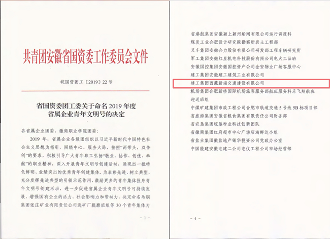 近日,省國資委團工委命名表彰2019年度省屬企業(yè)青年文明號集體,安徽路橋集團西藏新瑞公司獲“2019年度省屬企業(yè)青年文明號”榮譽稱號!