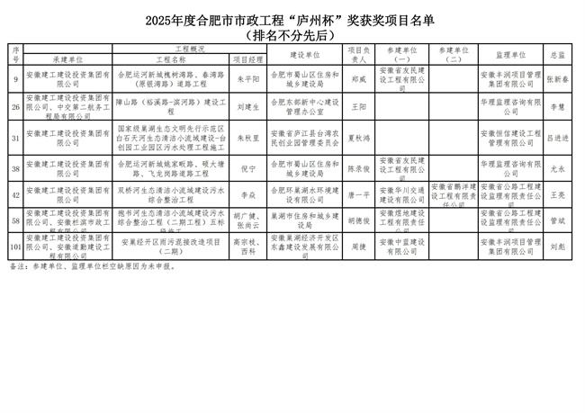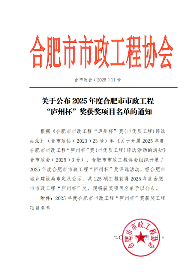 近日,合肥市市政工程協(xié)會(huì)正式揭曉2025年度“廬州杯”獎(jiǎng)評(píng)選結(jié)果,建工建投集團(tuán)申報(bào)的7項(xiàng)市政工程憑借過(guò)硬的工程質(zhì)量、創(chuàng)新的施工技術(shù)和完善的管理體系,在眾多參評(píng)項(xiàng)目中脫穎而出,全部榮膺該獎(jiǎng)項(xiàng)!
