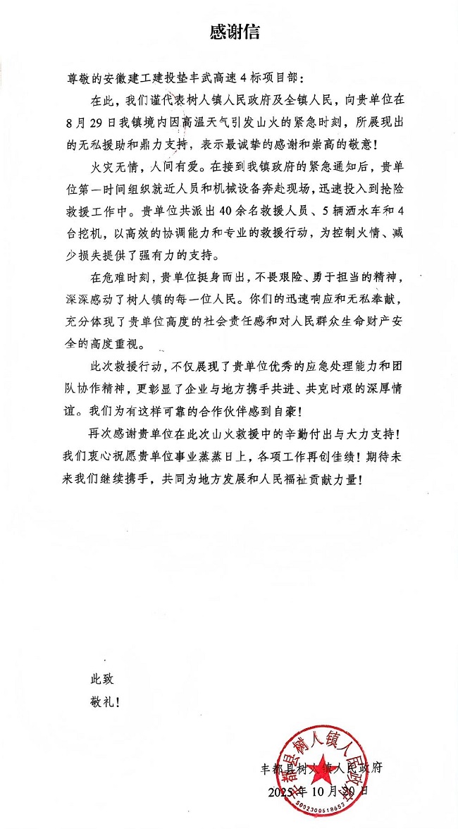 近日,豐都縣樹人鎮(zhèn)人民政府發(fā)來感謝信,對建工建投集團重慶墊豐武高速TJ04標項目在樹人鎮(zhèn)境內(nèi)因高溫天氣引發(fā)山火的緊急時刻,所展現(xiàn)出的無私援助和鼎力支持,給予最誠摯的感謝和崇高的敬意。