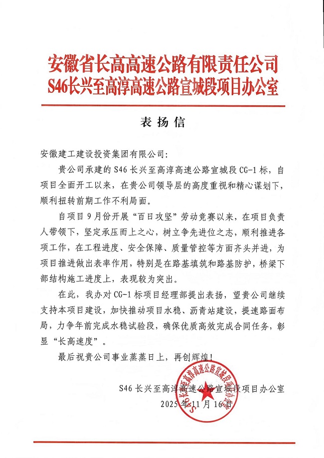 2025年11月18日,安徽省長高高速公路有限責任公司宣城段項目辦公室發(fā)來表揚信,對建工建投集團長高高速CG-1標項目在“百日攻堅”勞動競賽中的優(yōu)異表現(xiàn)予以高度贊揚。
