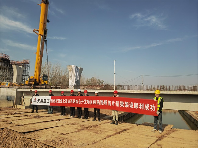近日,建工建投集團(tuán)淮北高鐵西站綜合開發(fā)項(xiàng)目緯四路橋首片預(yù)應(yīng)力混凝土小箱梁成功架設(shè),標(biāo)志著橋梁工程由下部結(jié)構(gòu)施工轉(zhuǎn)入上部結(jié)構(gòu)安裝階段。